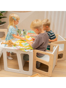 "Wprowadzaj urok inspirowanej Montessori naukę i zabawę w świat Twojego dziecka dzięki naszemu pięknie wykonanemu Montessori Wooden Kids Table and Chairs Set"Ten przemyślany zespół meblowy to coś więcej niż tylko miejsce do siedzenia; jest to p..